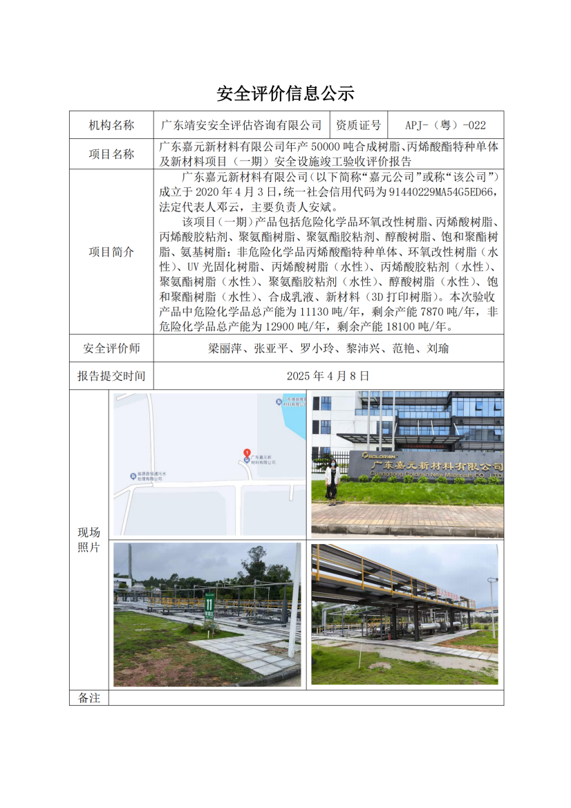 广东嘉元新材料有限公司年产50000吨合成树脂、丙烯酸酯特种单体及新材料项目(一期)安全设施竣工验收评价报告