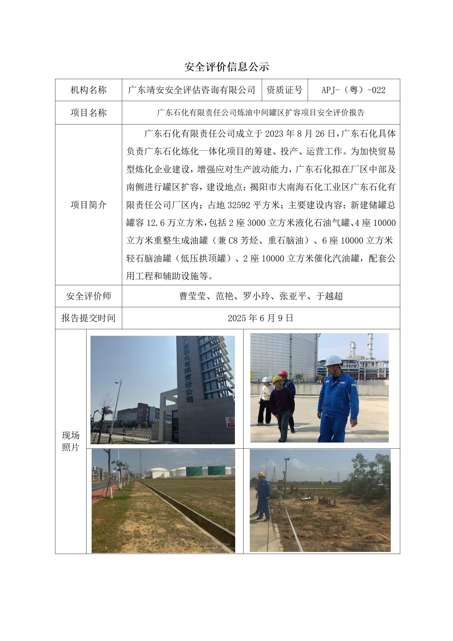 广东石化有限责任公司炼油中间罐区扩容项目安全评价报告